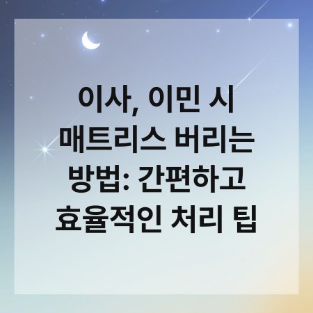 이사나 이민을 계획하면서 가장 고민되는 것 중 하나가 바로 매트리스 처리 방법입니다. 오래된 매트리스를 버리려면 어떻게 해야 할까요? 이 글에서는 간편하고 효율적인 매트리스 버리는 방법을 소개해 드리겠습니다. 매트리스는 부피가 크고 처리하기 어려운 경우가 많지만, 적절한 방법을 알면 간단하게 해결할 수 있습니다. 이사나 이민을 준비하는 분들에게 유용한 팁을 제공하니 끝까지 함께해 주세요.